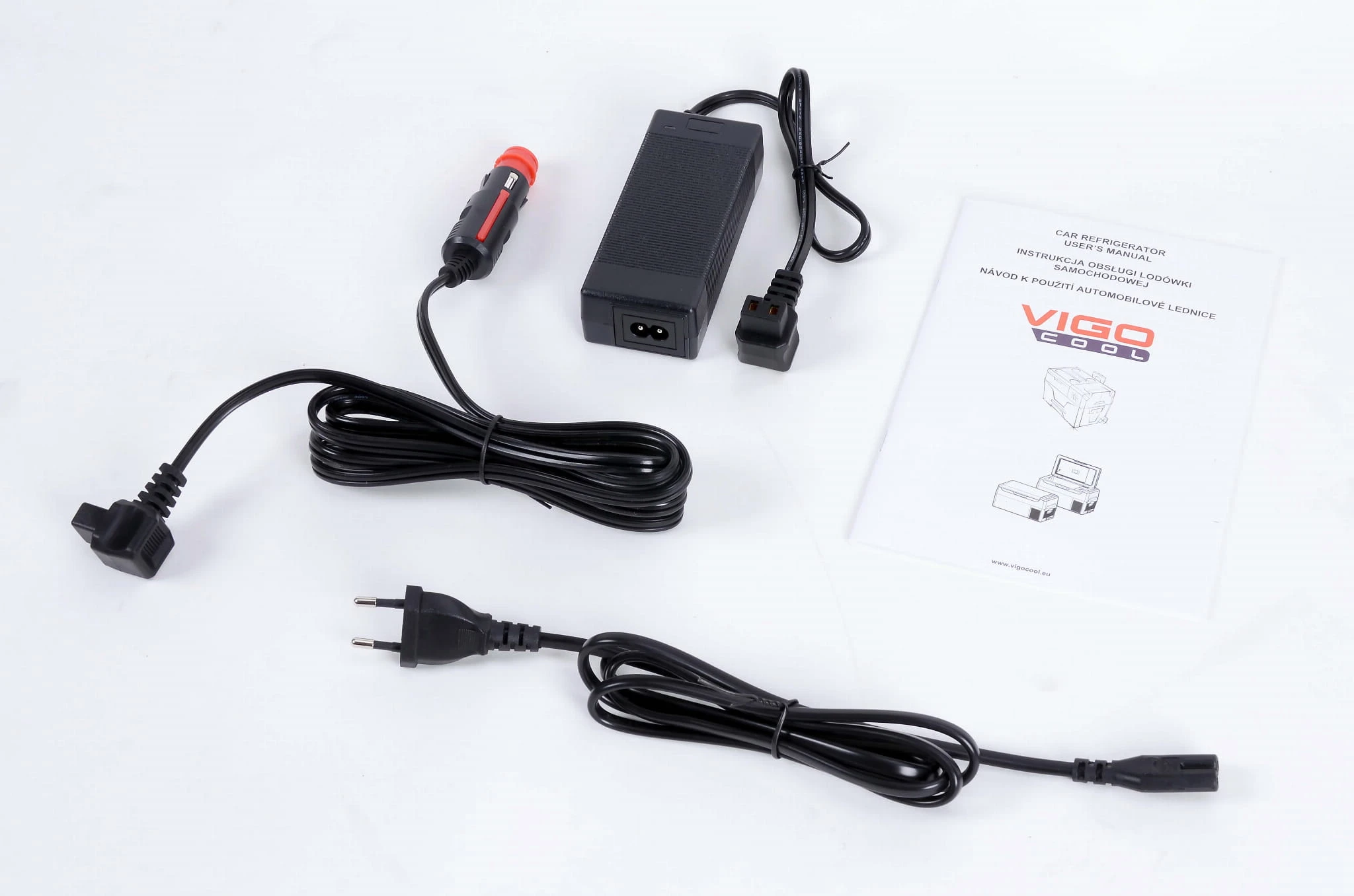 W zestawie komplet przewodów (pod zapalniczkę oraz pod gniazdko sieciowe).